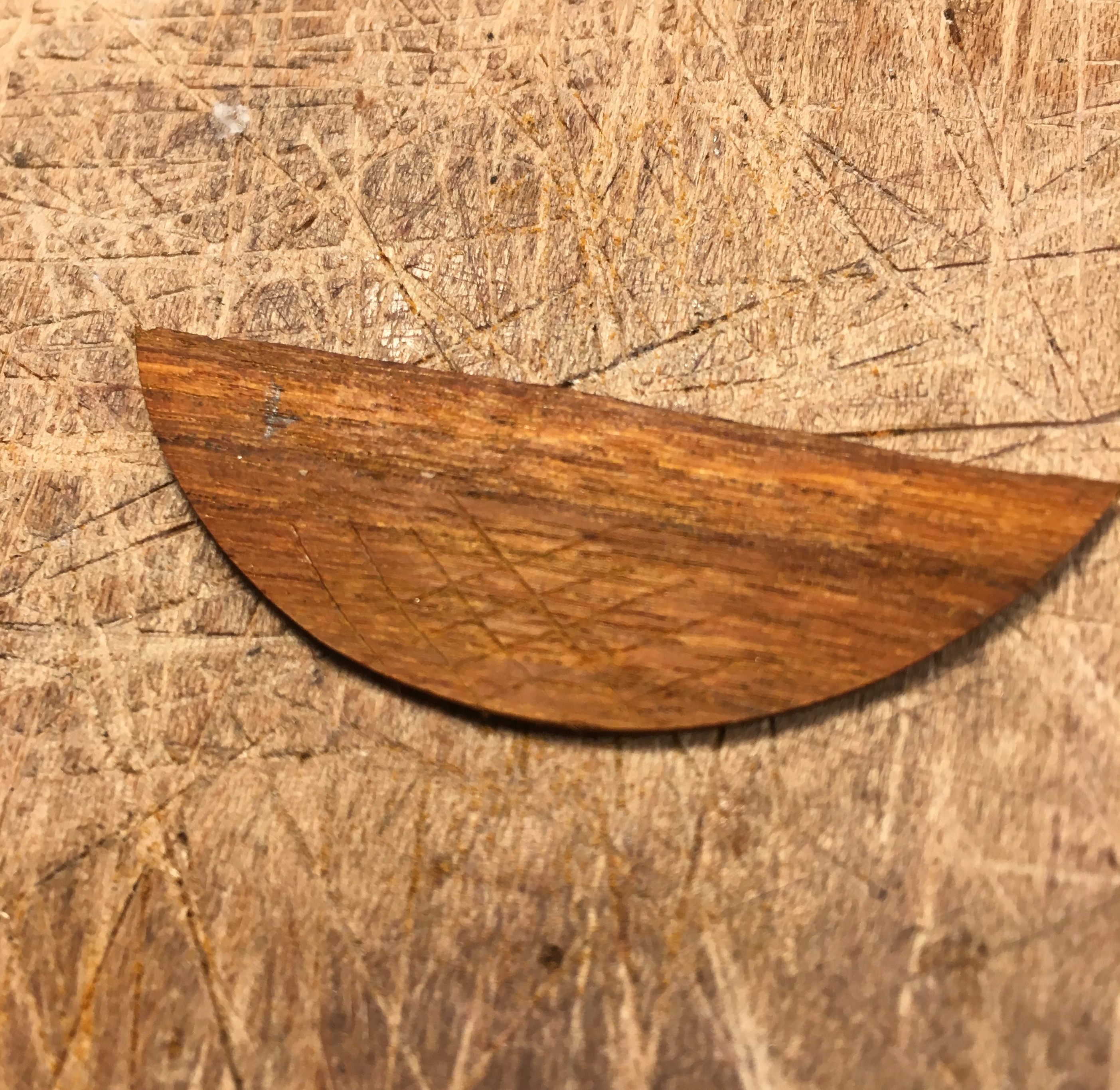 The pernambuco spline material is closely matched to the color of the stick. The wood is planed to thickness and shaped to match the width and radius of the groove.