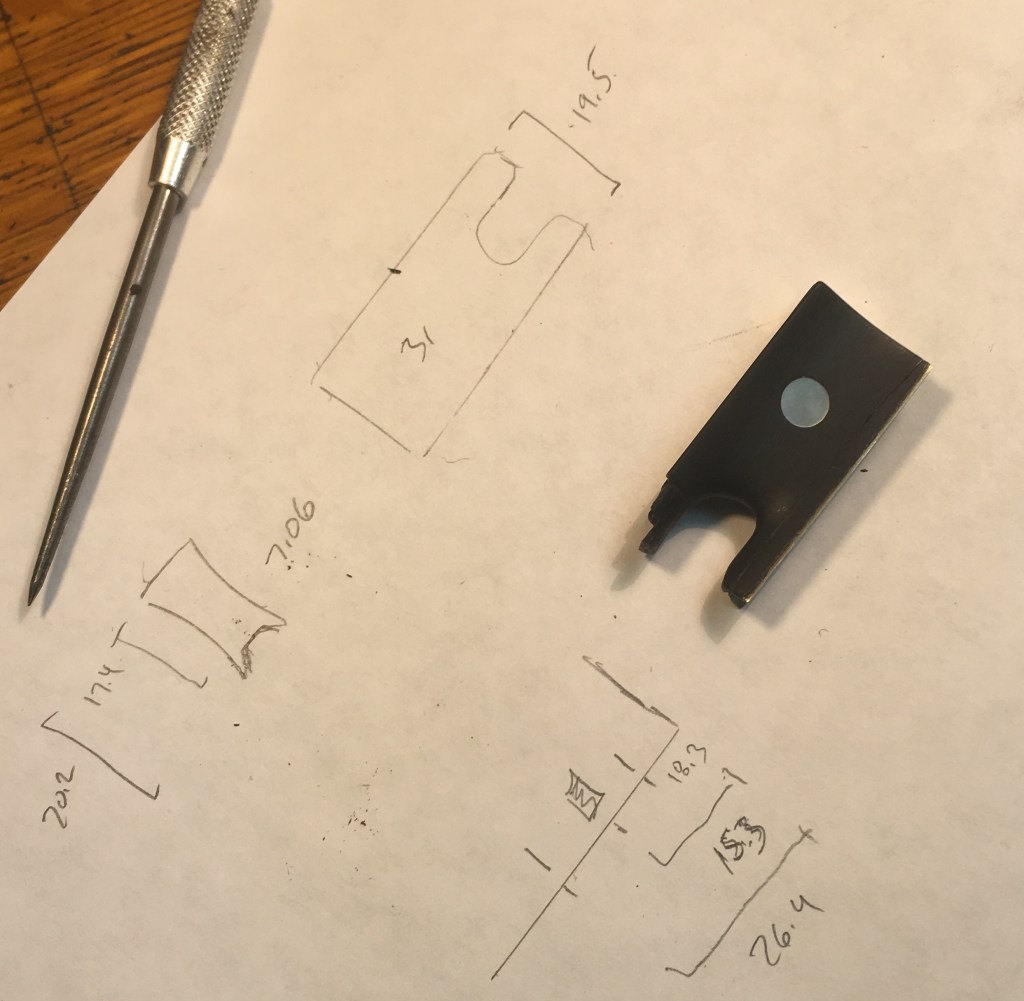 Before beginning a repair like this, a tracing and sketch are made of the existing frog. Critical dimensions are noted and will be used for reference when refitting the heal plate and liner.
