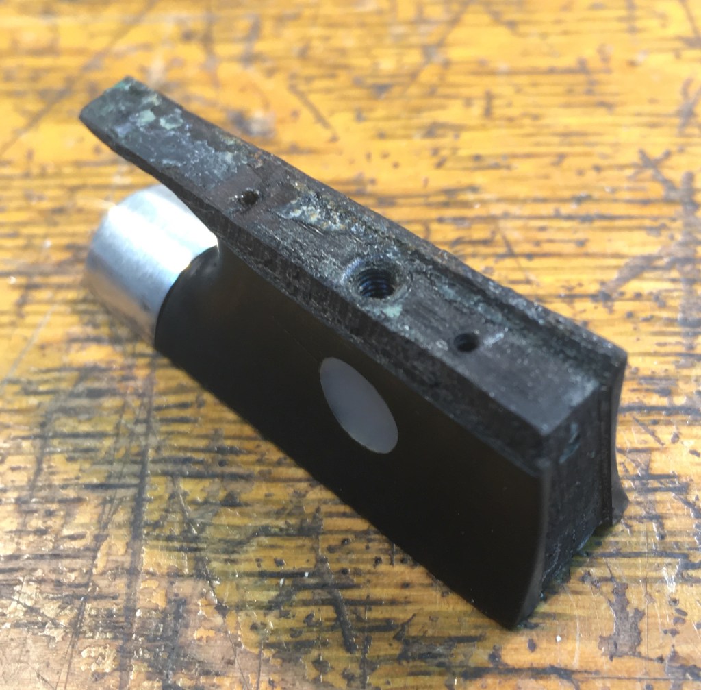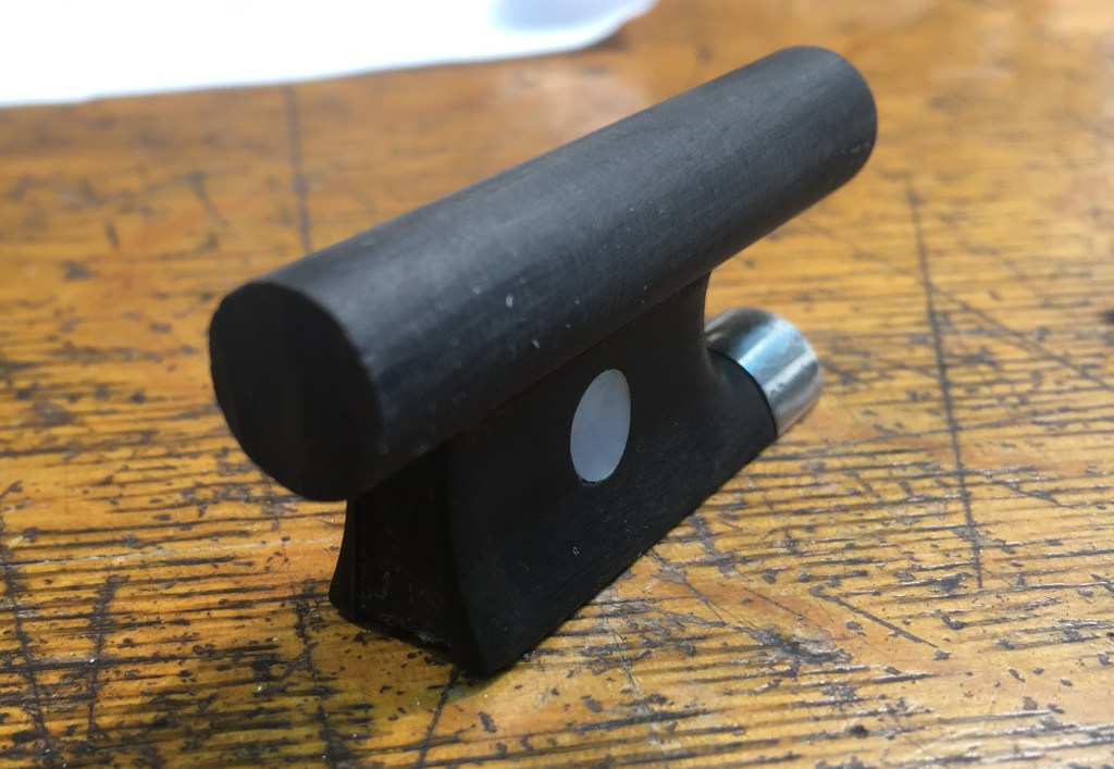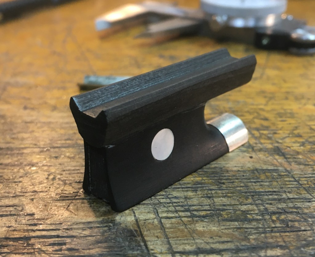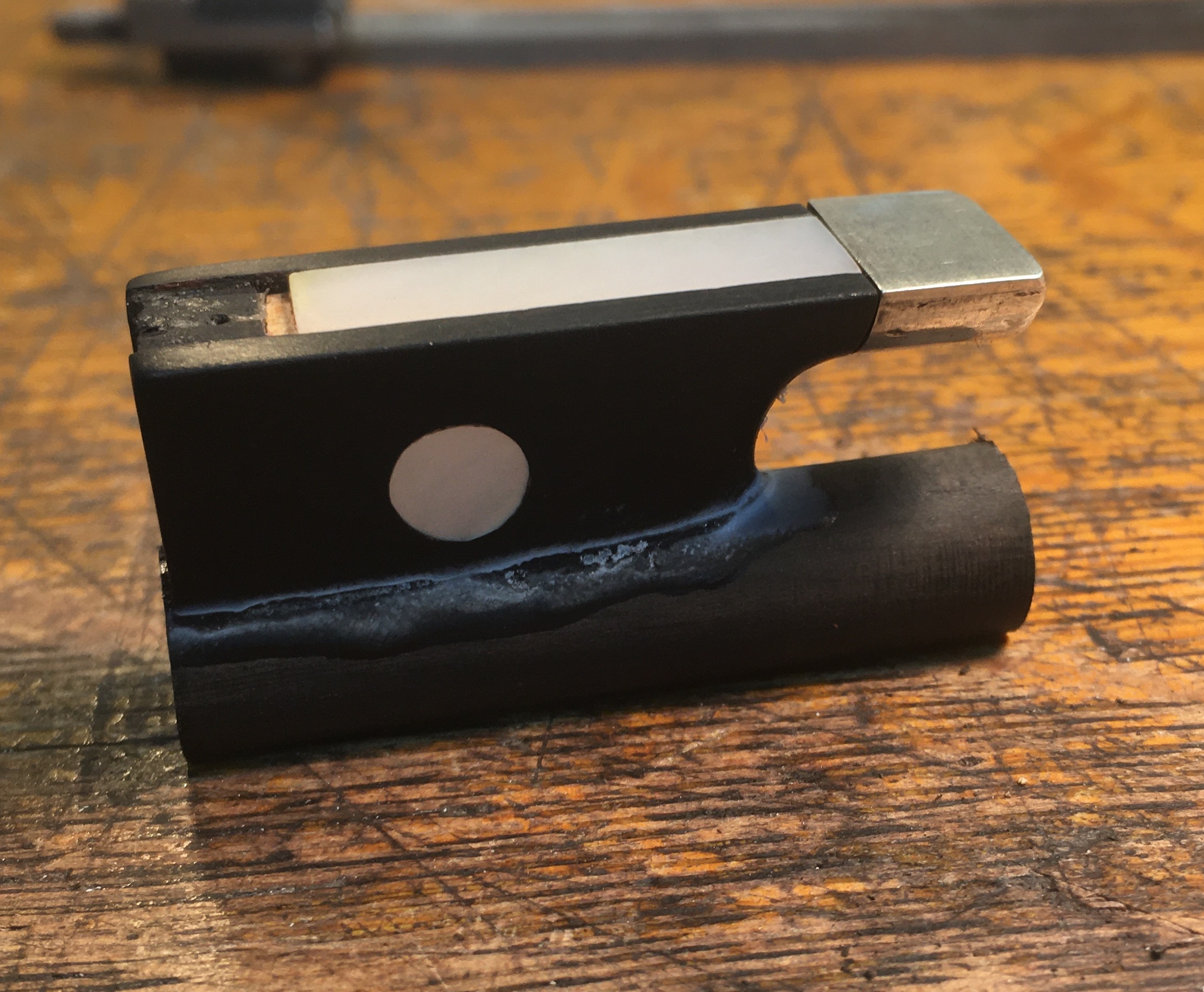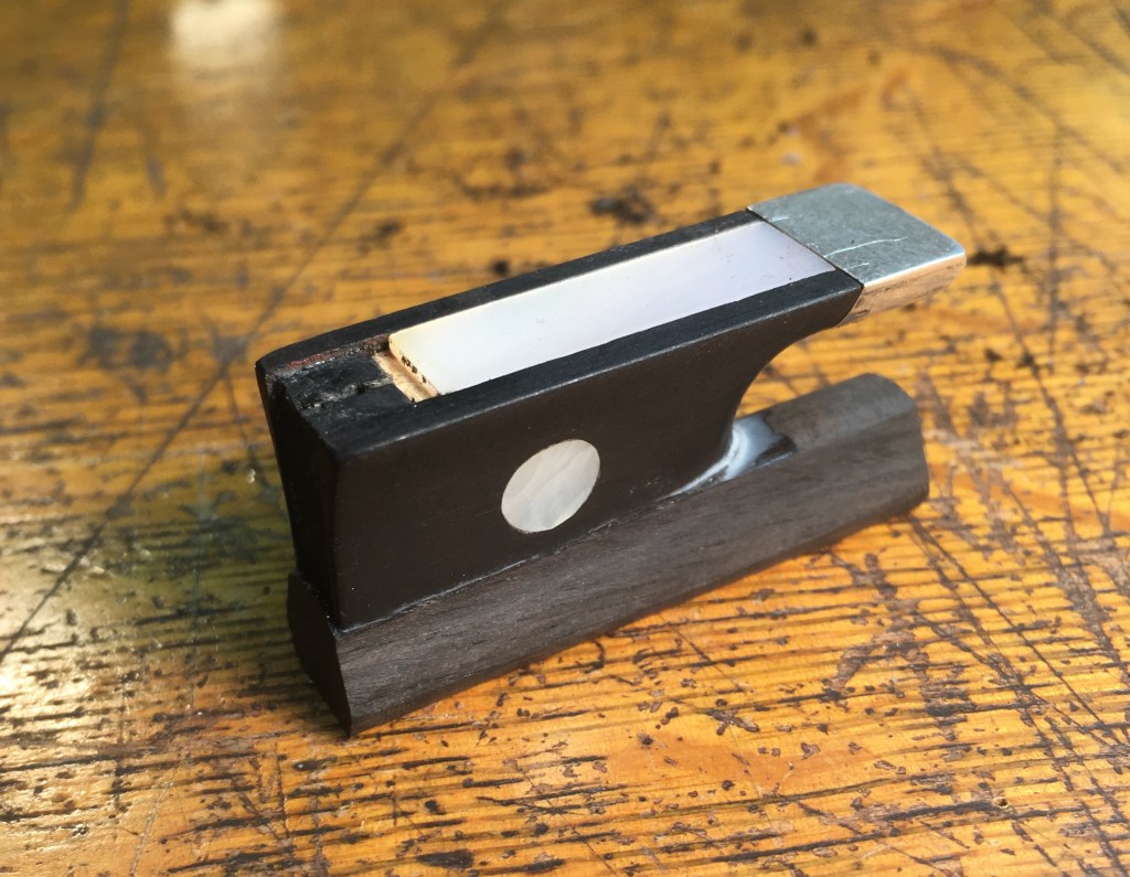 A cheval is done on a frog when a section has suffered major damage or is worn beyond the ability for the frog to function properly. I have updated my process for this type of repair since reading an article by Kari Azure from Triangle Strings.